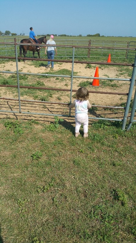 Our youngest member, Lacey Brunz, was watching Matthew Burgess ride. She was very excited and wanted to ride herself, but at 21 months old, is a year or so away from riding. She was, however, a good cheer leader.